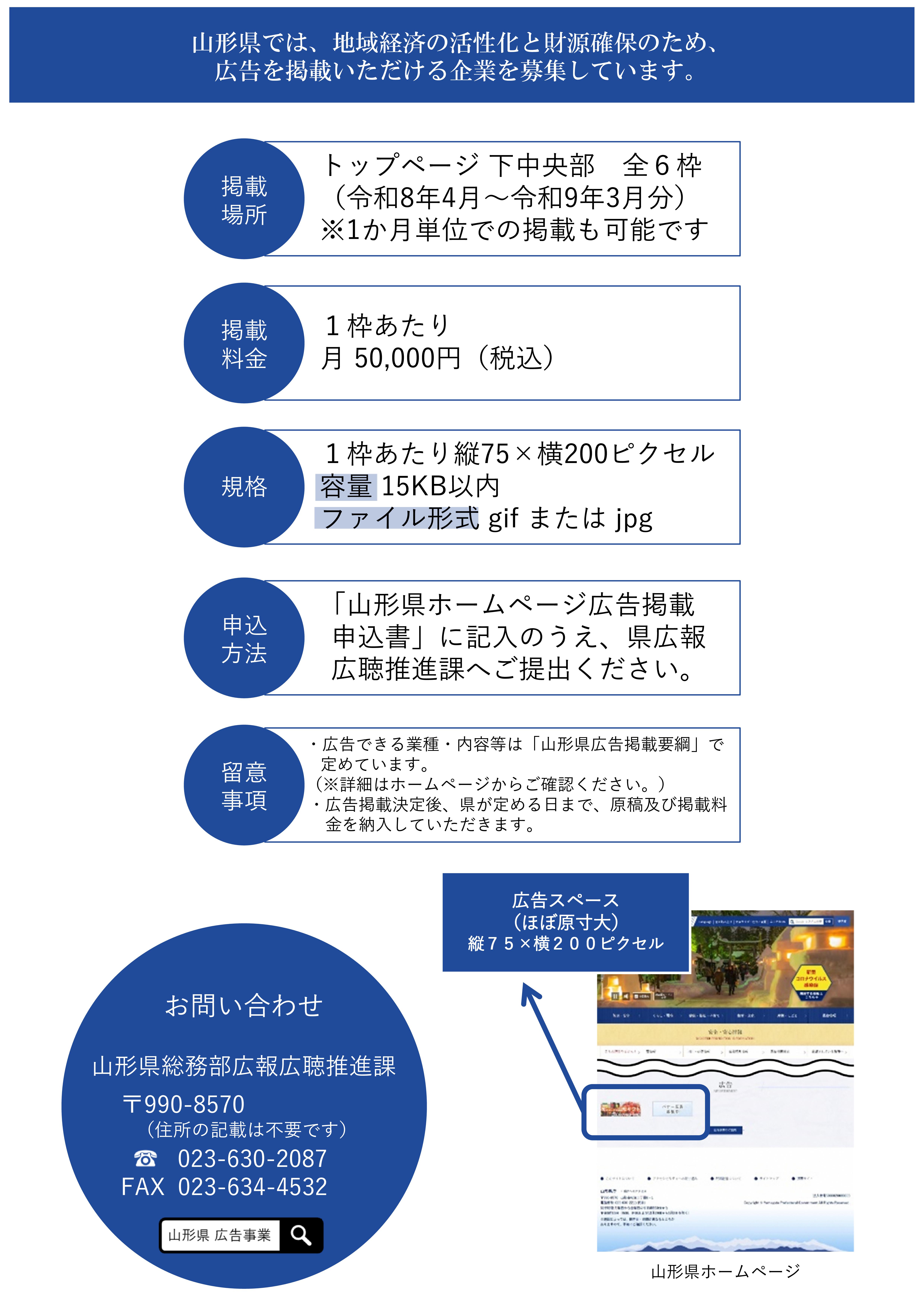 ホーム > 県政情報 > 情報公開・広報・広聴 > 広報 > 広告事業のご案内 > 山形県ホームページへ掲載するバナー広告(令和8年度)を募集しています